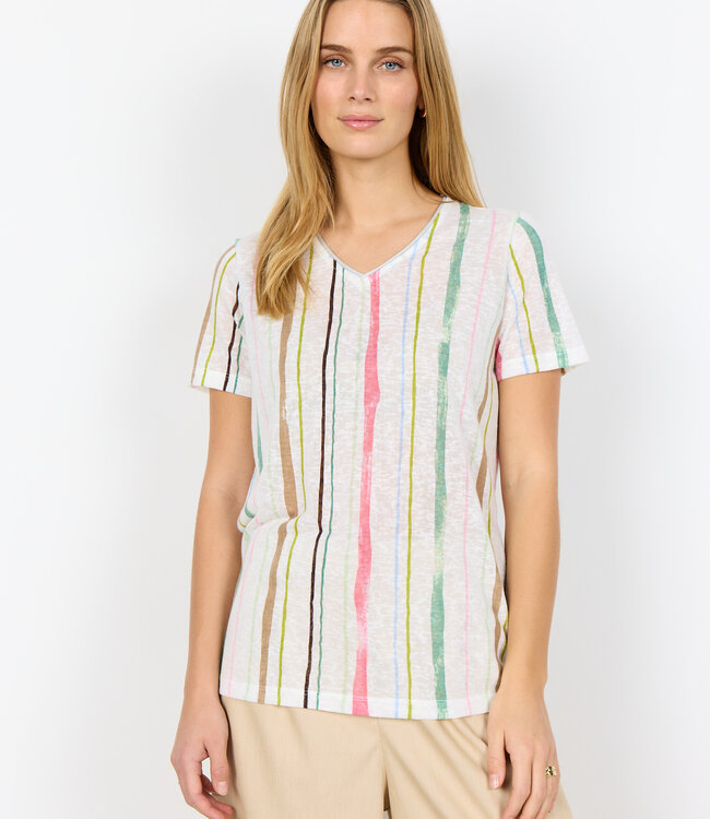 Das T-Shirt SC-ARETHA 44 besteht zu 100 % aus recyceltem Polyester. Dieses elegante Shirt besticht durch einen schmeichelhaften V-Ausschnitt und ein verspieltes Streifenmuster. Kombinieren Sie es mit Jeans oder einem Rock für einen lässigen und dennoch stylischen Look.
