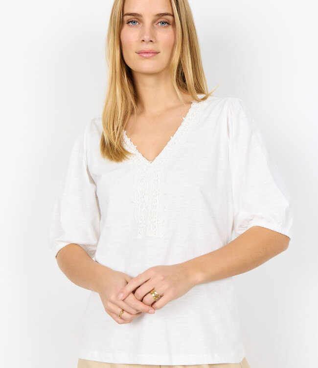 Das SC-BABETTE 73 T-Shirt besteht aus 100 % Bio-Baumwolle. Es besticht durch einen zarten V-Ausschnitt mit aufwendigen Spitzendetails und gerafften Ärmeln. Dieses elegante Oberteil lässt sich lässig mit Jeans oder elegant mit einem Rock kombinieren.