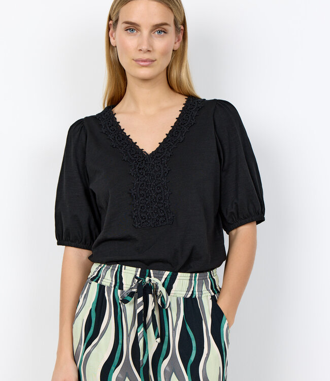 Das SC-BABETTE 73 T-Shirt besteht aus 100 % Bio-Baumwolle. Es besticht durch einen zarten V-Ausschnitt mit aufwendigen Spitzendetails und gerafften Ärmeln. Dieses elegante Oberteil lässt sich lässig mit Jeans oder elegant mit einem Rock kombinieren. Lesen Sie mehr.