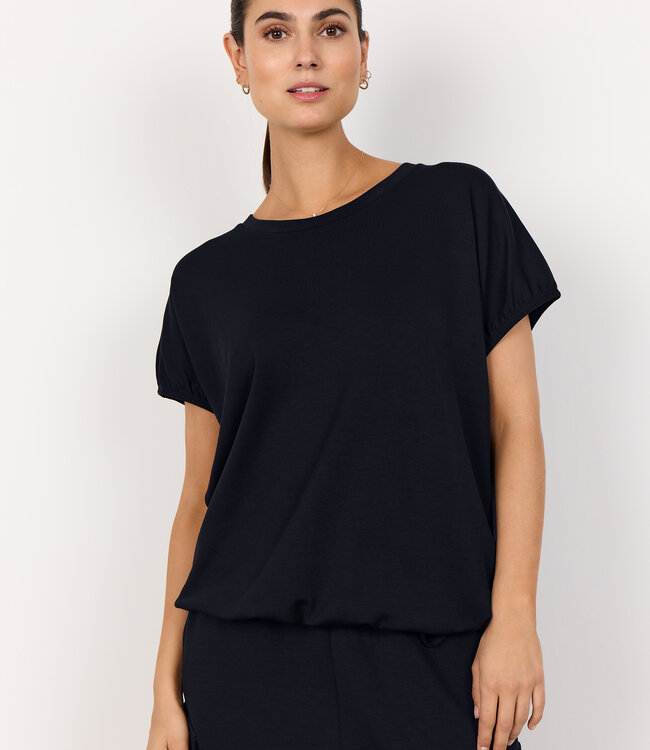 Das T-Shirt SC-BANU 237 besteht aus 48 % Modal, 48 % Polyester und 4 % Elastan. Es hat einen klassischen Rundhalsausschnitt, kurze Ärmel und einen stylischen Kordelzug am Saum für eine individuelle Passform. Kombinieren Sie es mit Jeans oder einem Rock für einen lässigen und individuellen Look.