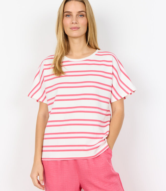 Das T-Shirt SC-BARNI 50 besteht aus 48 % Modal, 48 % Polyester und 4 % Elastan. Es hat einen klassischen Rundhalsausschnitt, kurze Ärmel und ein elegantes Streifenmuster. Kombinieren Sie es mit Jeans oder Shorts für einen lässigen Look.