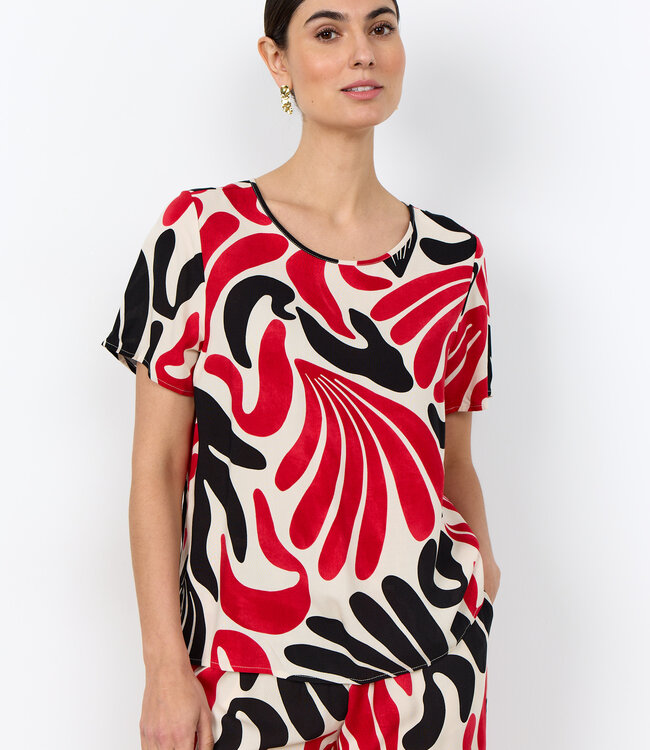 Die Bluse SC-FELDI 2 ist aus 100 % LENZING™ ECOVERO™ Viskose gefertigt. Sie hat einen Rundhalsausschnitt, kurze Ärmel und einen künstlerischen, abstrakten Print. Kombinieren Sie sie mit einer schmal geschnittenen Jeans oder einem eleganten Rock für einen lässigen Look.