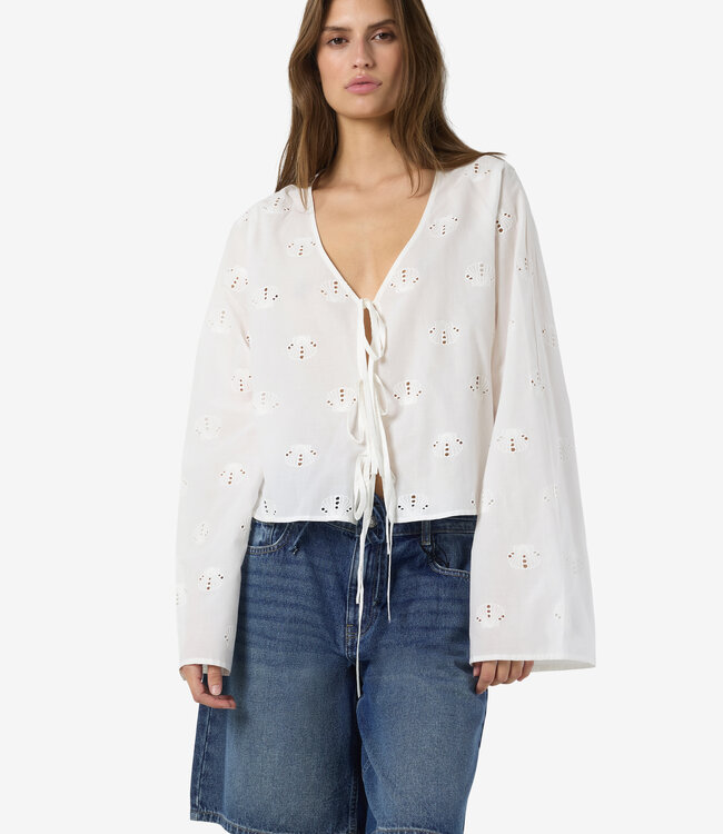 The NMASHLEY L/S TIE V-NECK SHIRT WVN FWD from Noisy May is a stylish women’s blouse that combines a feminine look with modern design. It features long sleeves and an elegant V-neck with a tie detail, adding a refined and playful touch. The Cloud Dancer / Sea Shells colour combination gives the blouse a soft and fresh appearance.