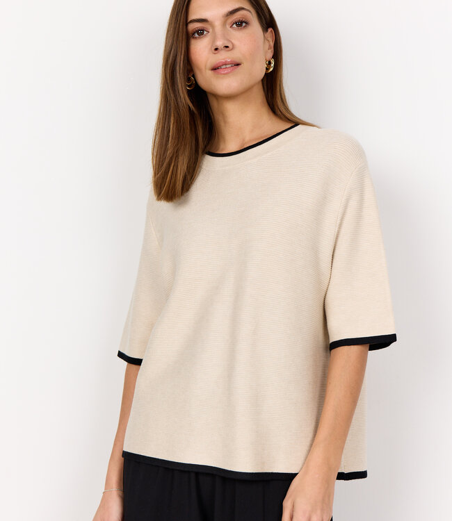 SC-DOLLIE 793 is a Pullover crafted from 75% Viscose, 25% Nylon. The pullover features a round neckline, short sleeves, and textured ribbed design with contrast trim detailing. Pair it with tailored trousers or a relaxed skirt for a stylish look. Read more.