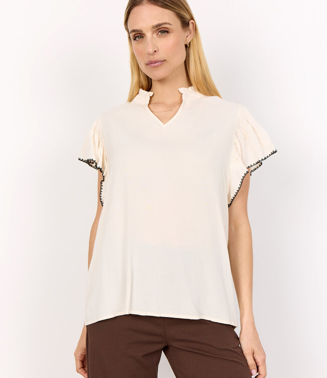 SC-RADIA 215 Blouse is crafted from 100% LENZING™ ECOVERO™ Viscose. It features a ruffled high-neck collar, cap sleeves with delicate trim, and V-neckline. Pair it with tailored trousers or a classic skirt for a refined look.