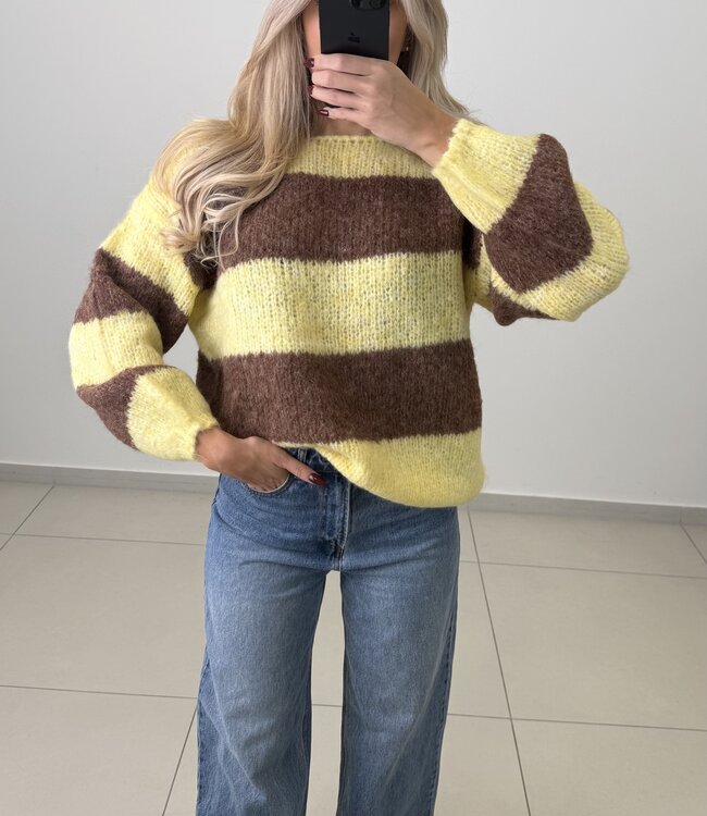 De ARI STRIPES PULLOVER (Yellow Toffee) van The Frenchies is een stijlvolle damestrui met een frisse en speelse uitstraling. De zachte breikwaliteit zorgt voor een comfortabel draaggevoel en maakt deze trui perfect voor dagelijks gebruik. Het streeppatroon geeft de trui een tijdloze, modieuze look, terwijl de Yellow Toffee-kleurcombinatie warmte en vrolijkheid toevoegt. Ideaal te combineren met jeans, rokken of nette broeken voor een casual-chique outfit.