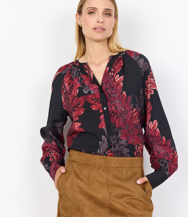 Het SC-VAIKE 1 overhemd is gemaakt van 85% LENZING™ ECOVERO™ viscose en 15% nylon. Het heeft een zachte, geplooide ronde kraag, een knoopdetail aan de voorkant, lange mouwen en een opvallende bloemenprint. Combineer het met een klassieke jeans voor een casual look of een pantalon voor een meer formele gelegenheid.